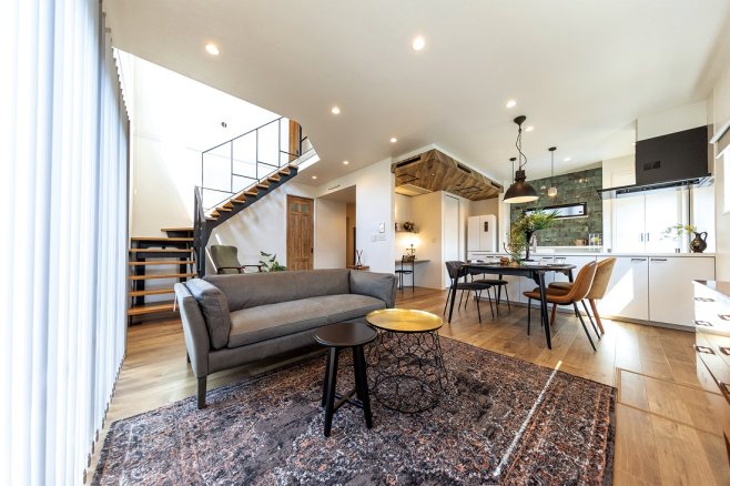 いつも家族の気配を感じられるスケルトンのリビング階段。ブラックのアイアンを採用することで、建物のアクセントにもなり開放感も得られる階段にしました。