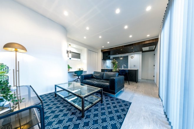 ウォルナットの「マイスターズ・ウッド」が落着きを与えてくれる床、大理石調のアクセントクロスが寝室をシック&モダンに演出するオーセンティックな空間です。