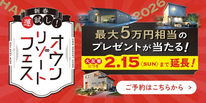 | 備考 | 【ハズレなし!運試し特典】 ★運試し1★:大人 最大5万円相当のプレゼントが当たる「おみくじ」 ★運試し2★:子供 出目の数によってもらえるトイザらスギフト券「サイコロ」 ※新築住宅をご検討のうえ期間中にご夫婦で来場、且つ初めて当社のモデルハウスに来場される方が対象です。 ※来場時に簡単なアンケートへのご回答が条件です。 ※景品の色は選べません。 ※現在お打合せの方は対象外とさせていただきます。 ※他社で設計・施工中の方及び同業者の方のご見学はお断りしております。 ※この他、事務局にて不正と判断した場合は対象外となります。 |