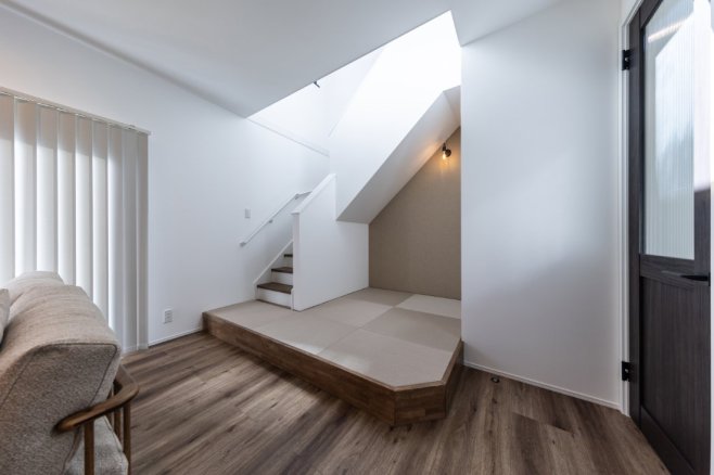 吹抜けの開放感、おこもり感のあるヌック、腰掛けや遊び場になる小上がり。コンパクトな広さながらも居場所の多さと豊かさを体感できる、心地よい理想を盛り込んだリビングです。