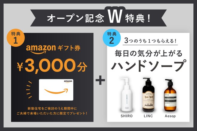 | 備考 | ☆Amazonギフト券 ¥3,000分をプレゼント☆ 新築住宅をご検討のうえ期間中にご夫婦で来場いただいた方限定の特典となります。 (1組様1回のお渡しとなります。) ※1:初めてご来場される方に限ります。 ※2:他社で設・施工中の方及び同業者の方のご見学はお断りしております。 ★オープン記念 特典★ 3つの中からどれか1つがもらえる! 毎日の気分が上がるハンドソープをプレゼント。 |