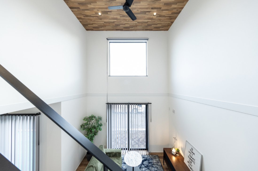 吹き抜けリビングの開放感と自然光が