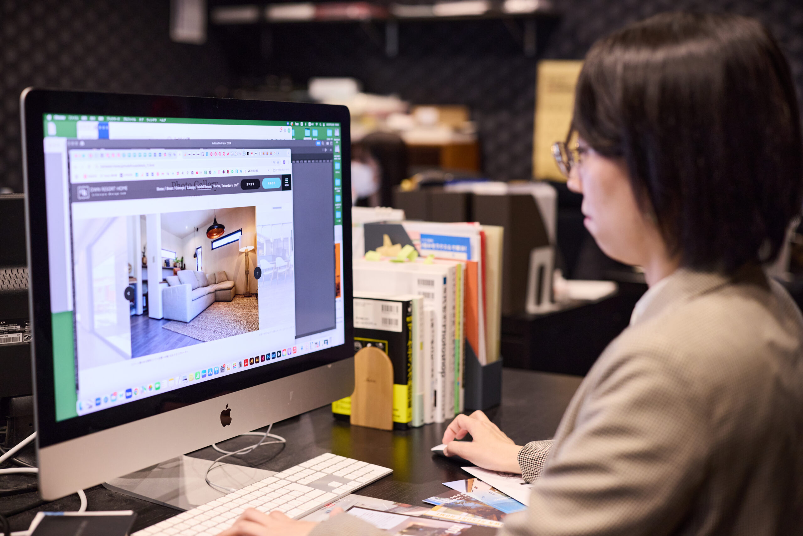 パースを作成するにあたって、PCのソフト内に登録されている様々な素材があるのですが、それをそのまま貼り付けるだけでは、実際のイメージとずれてしまうことが多いです。その時に、既製の素材だと表現しきれない部分を自分で考えてカスタマイズして表現するようにしています。お客様がそのパースをご覧になることで、より具体的なイメージを持ちながら安心して打合せを進められたり、建物完成後に「パースとほぼ一緒!」というお言葉を頂けると、本当に嬉しいです。自分がこだわって作り込んだものが伝わっているな、とやりがいを実感できる瞬間です。
